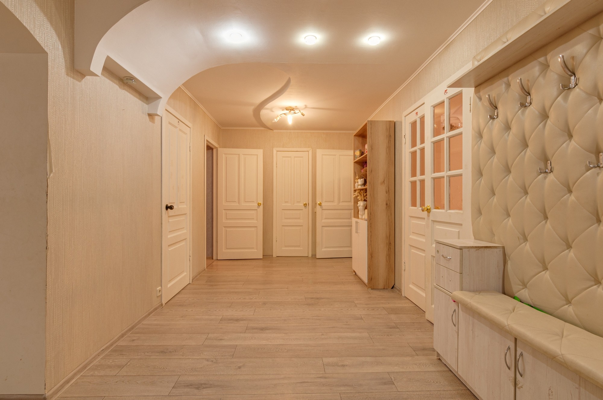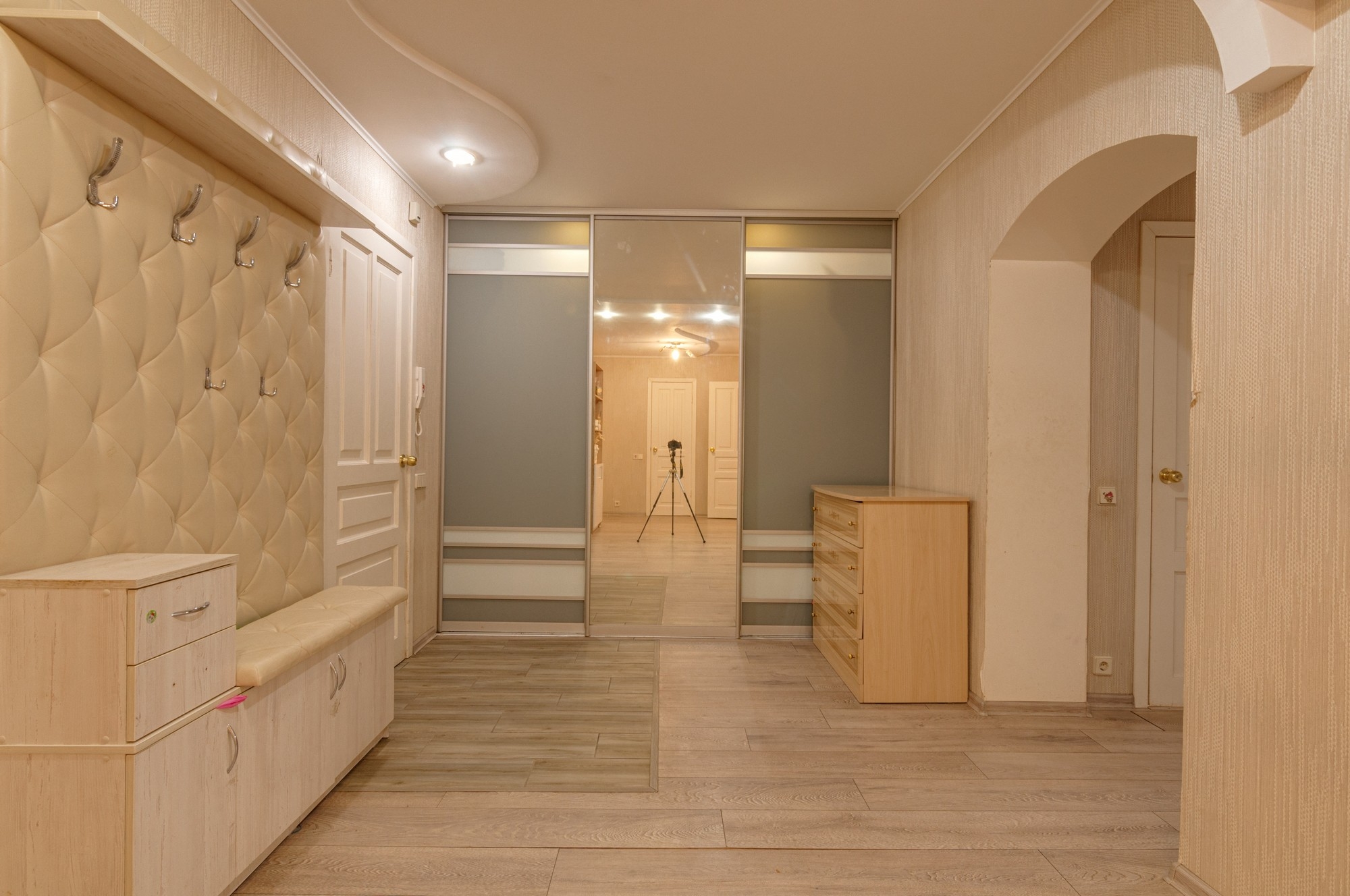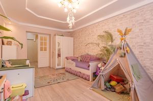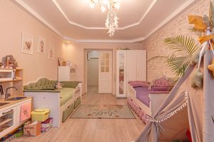 В подарок новым собственникам остается кухонный гарнитур с варочной поверхностью и вытяжкой, стол с тумбами и шкафами в детской, стенка- вешалка в холле, наполнение (система полок и ящиков) в гардеробной.