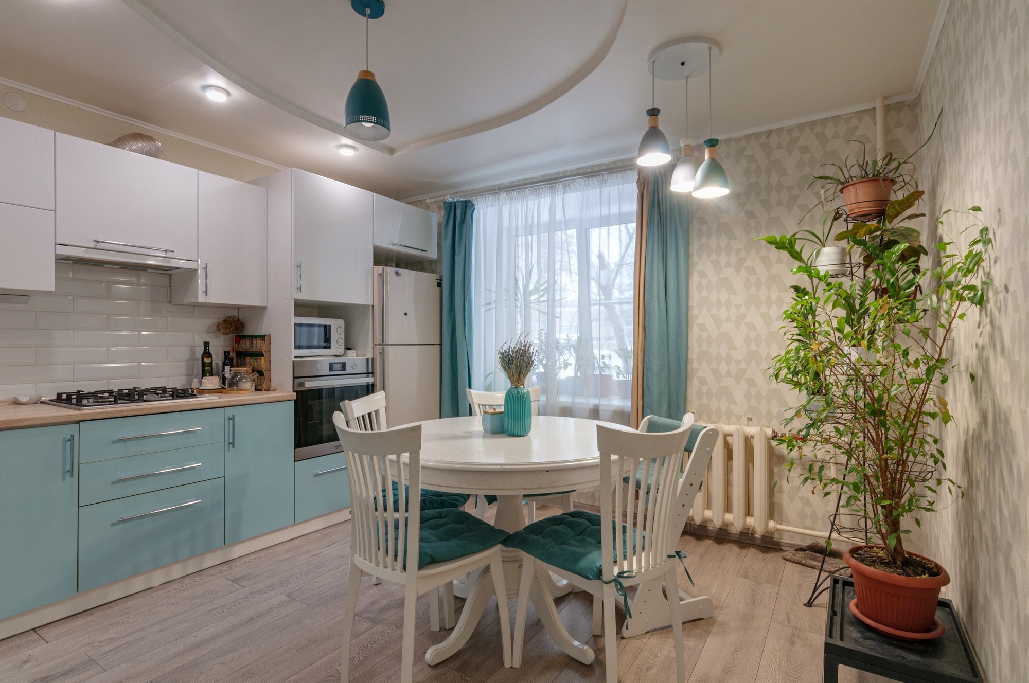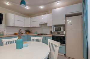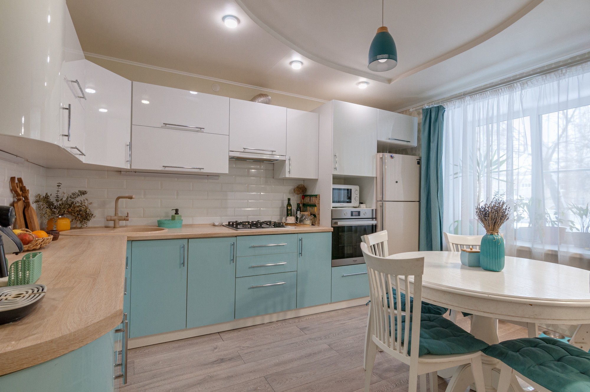 - кухня-гостиная 13,8 кв.м., где может собираться вся семья. Установлен современный кухонный гарнитур с мойкой, варочной поверхностью, вытяжкой и системой фильтрации воды.
