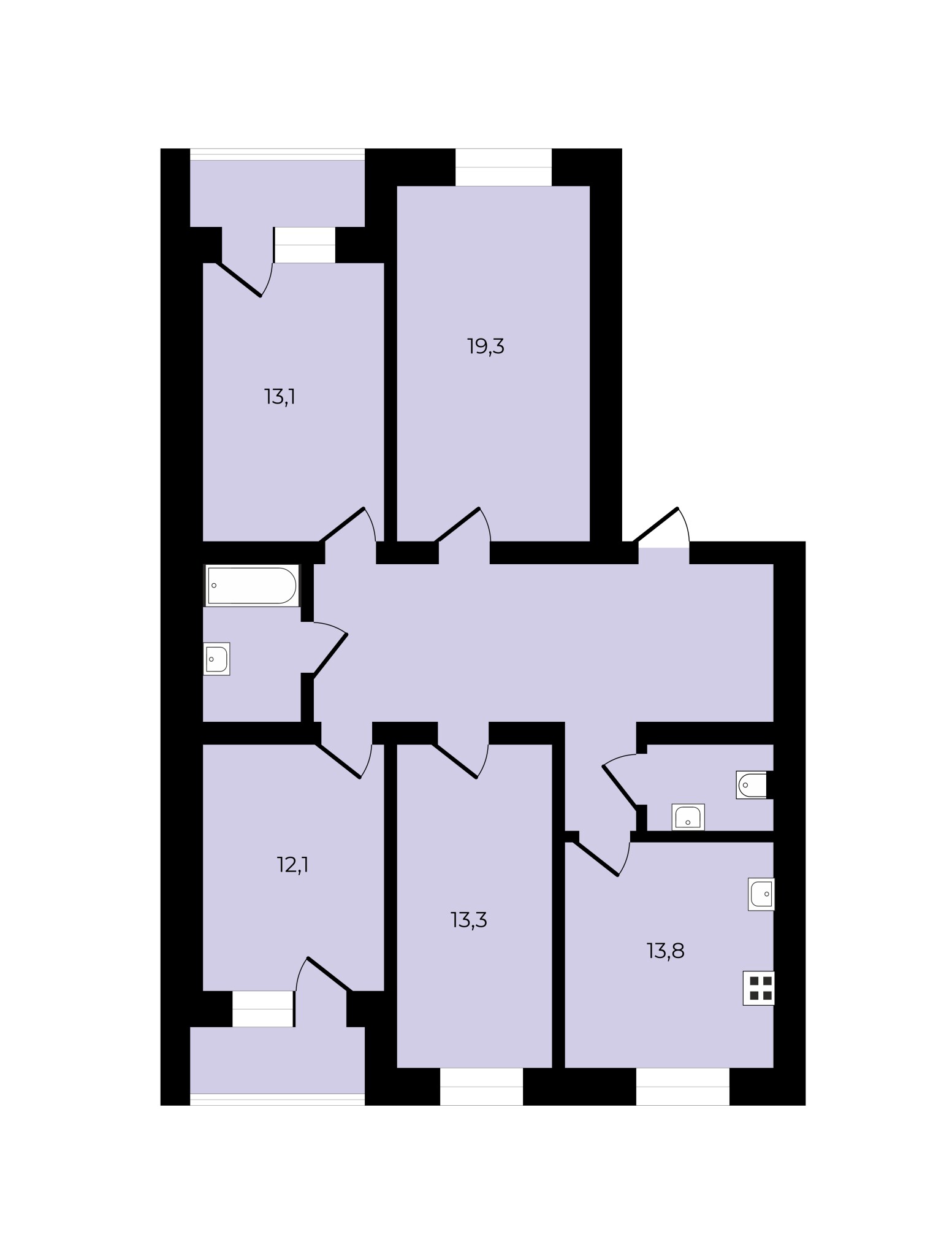 - четыре изолированные просторные комнаты правильной формы 12,1+13,1+13,3+19,3 кв.м. (пол - качественный ламинат, стены - обои). Комнаты выходят на разные стороны, что обеспечивает комфортный микроклимат в квартире и быстрое проветривание.