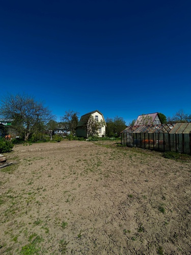 На участке каркасный двухэтажный дом. На первом этаже кухня и спальня, на втором этаже спальня. Сделана пристройка для хозяйственных нужд. Установлены две теплицы, одна из них под ремонт.