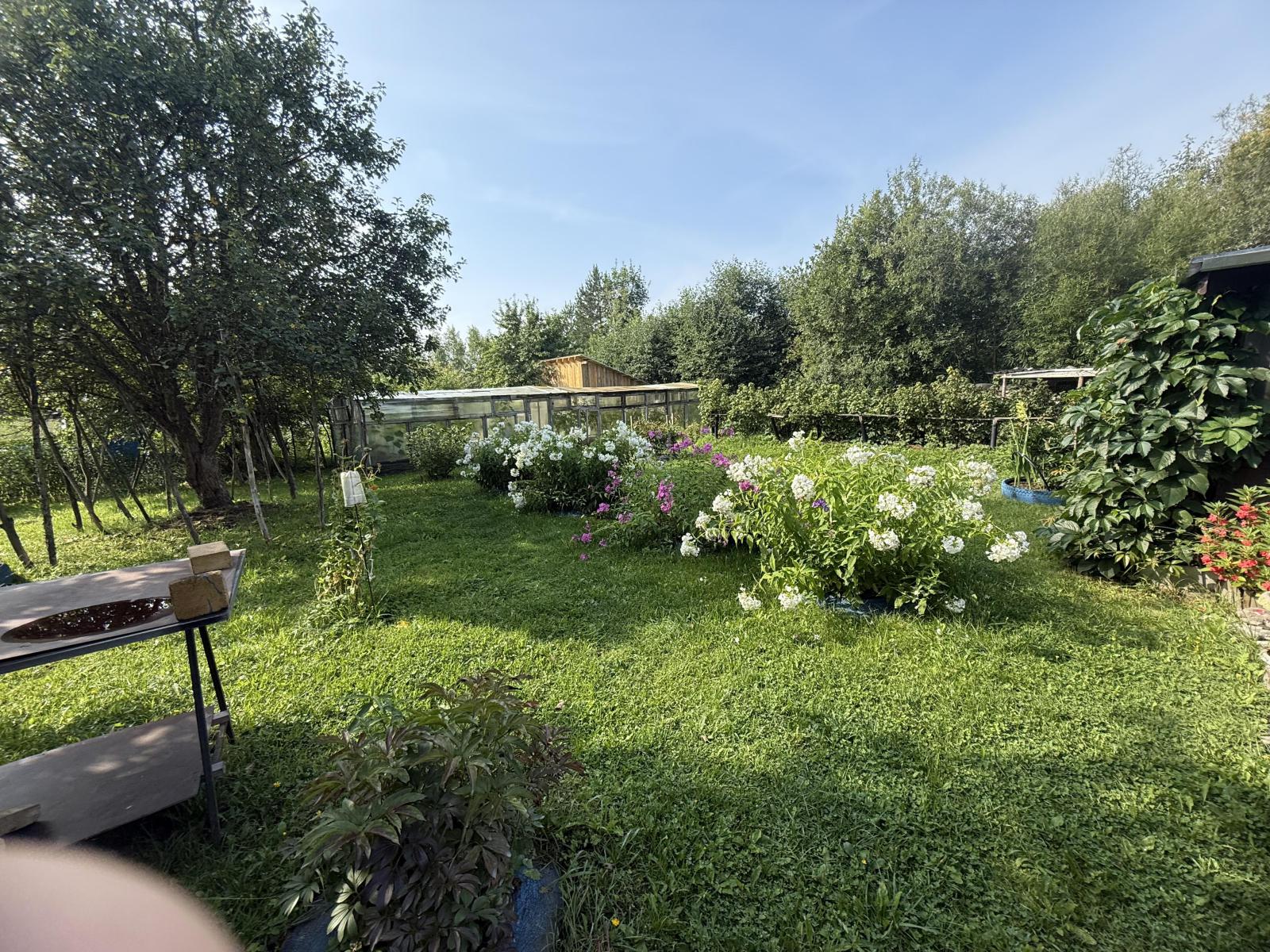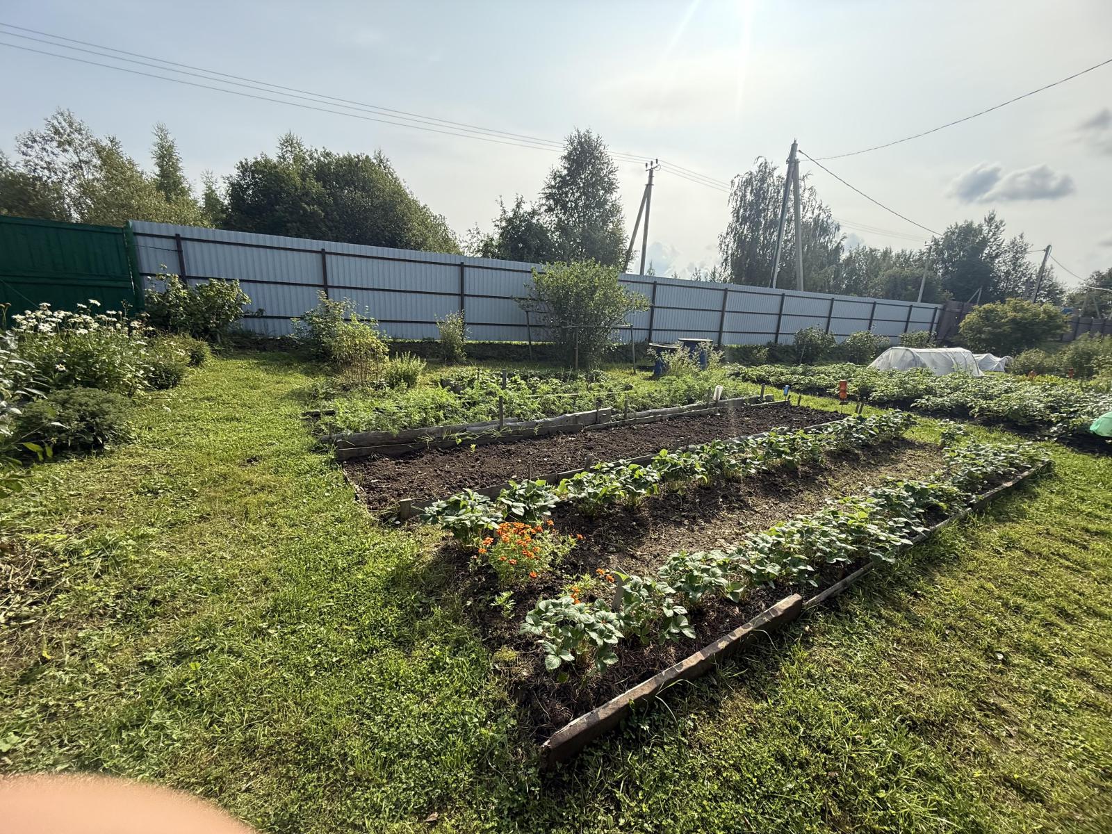 На участке расположены: три теплицы, яблони, кусты малины, смородины, крыжовника. Разбиты грядки, где выращивать можете картофель, клубника, фасоль, кукуруза.