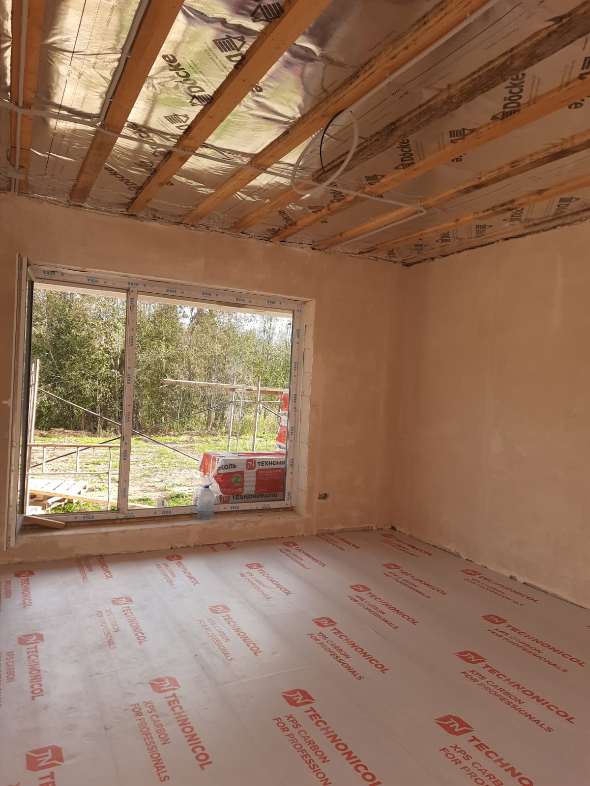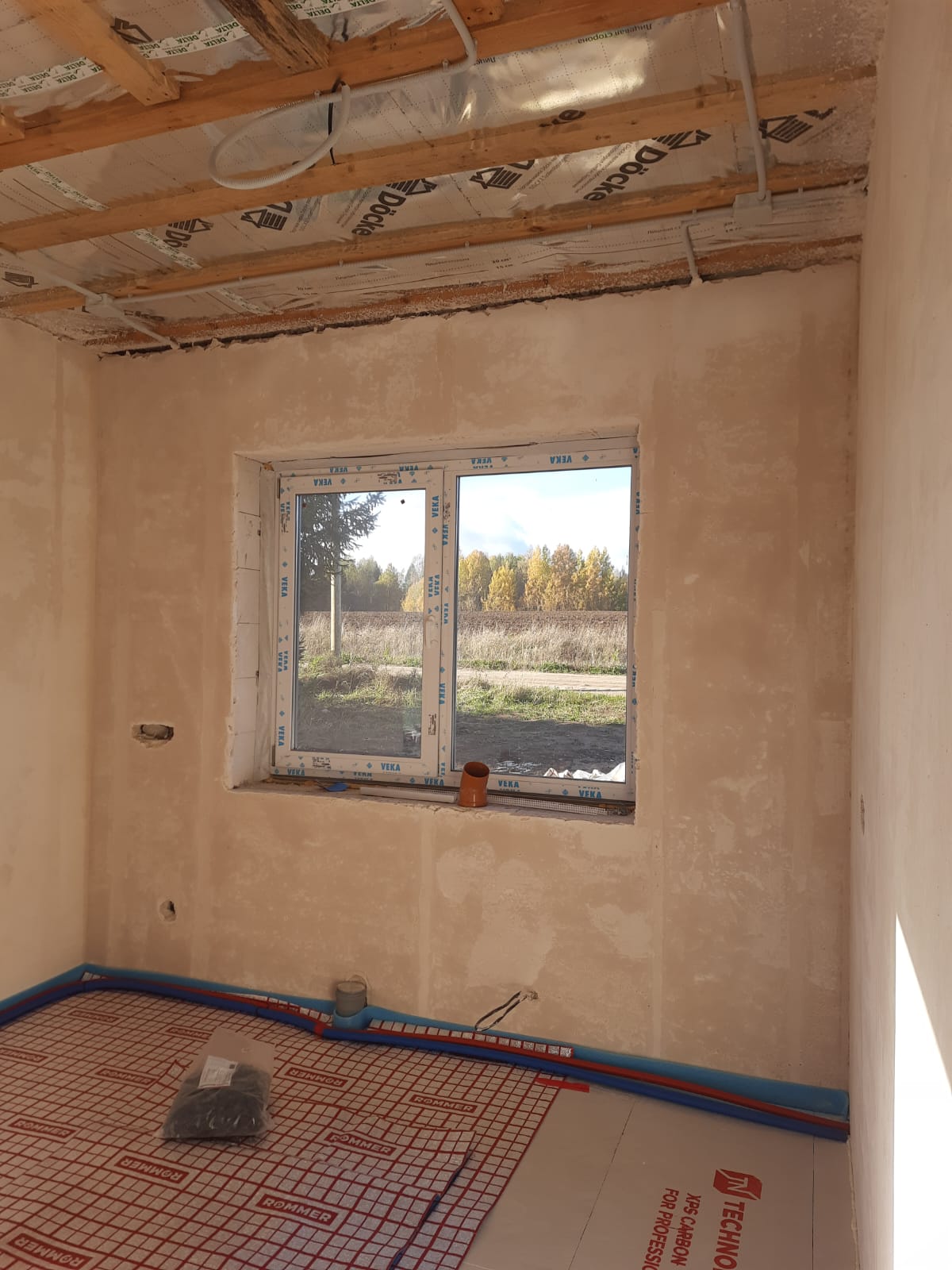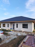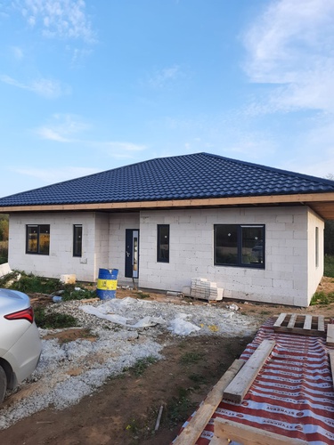 Фундамент монолитная плита 250мм, ( бетон М-300, арматура 12 с ячейках 200*200), вокруг фундамента сделан дренаж, стены газобетонные блоки YTONG D400 400мм, кровля металлочерепица 0,5мм серого матового цвета ( стальной бархат), водосточная система Docke premium, перекрытие утеплено 250мм негорючим утеплителем, окна профиль Veka ( softline-70) с ламинацией фасадной части в антрацитово-серый матовый цвет, стеклопакеты 40мм энергосберегающие. Входная дверь с терморазрывом.