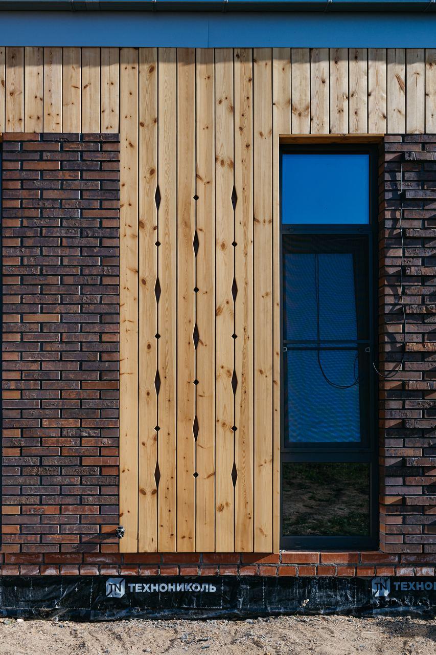 — Уникальный фасад с 3D-кладкой и натуральной древесиной.