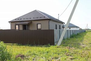 Сухой, ровный участок 14 соток правильной формы с шикарным газоном. Установлен забор по всему периметру: по лицевой стороне забор сплошного заполнения с откатными воротами, между соседями - штакетник.
