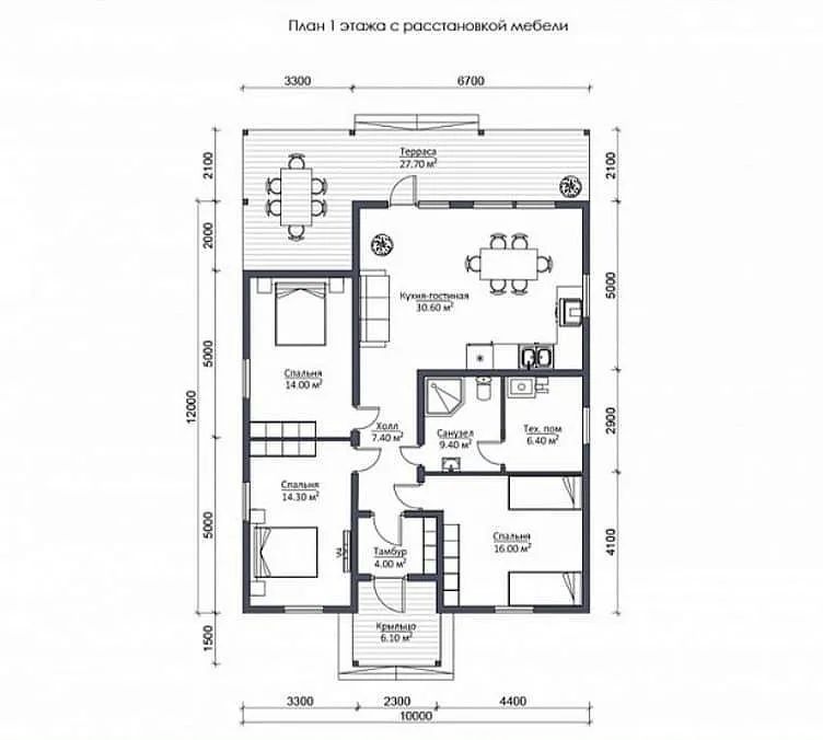 Функциoнальный cовpeменный дoм c рeгиcтpaциeй и страховкой площадью 126.6 кв.м., с просторной терассой и удачной планировкой: три спальни, просторная кухня- гостинная с двумя выходами на террасу (из гостиной и комнаты), санузел, техническая комната.