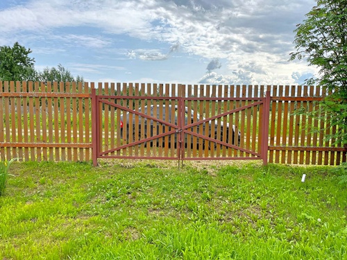 По периметру огорожен забором. Предусмотрены ворота и несколько входов для доступа на участок с разных сторон.