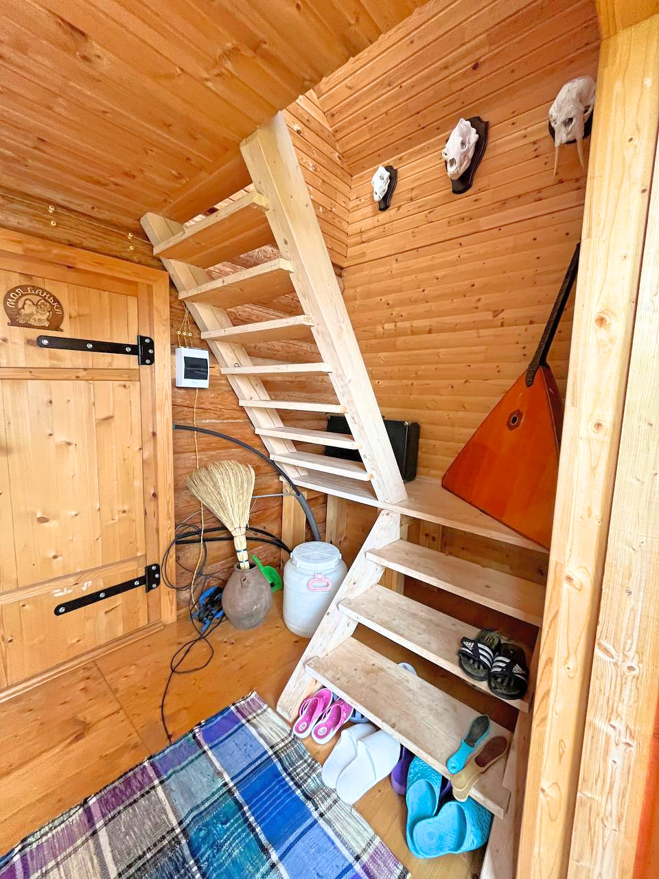 Дом-баня делится на несколько функциональных зон: прихожая, гостинная, помывочное помещение и парная на первом этаже, широкий коридор и спальня - на втором.