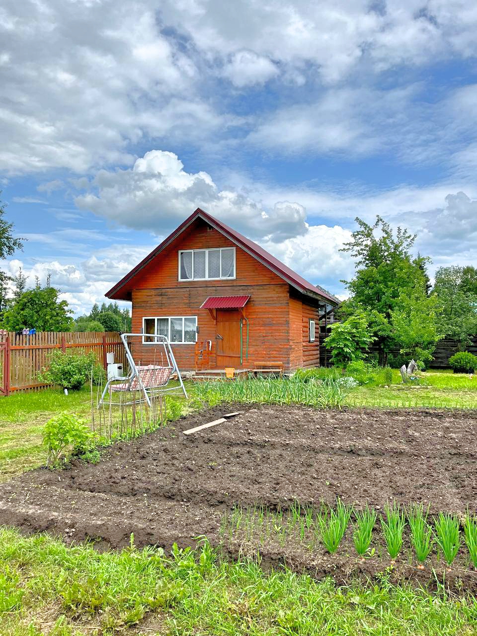 Прежде всего, на участке располагается классический деревенский дом из рубленого бревна со всеми полагающимися постройками.