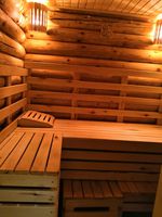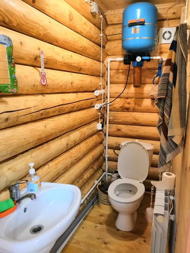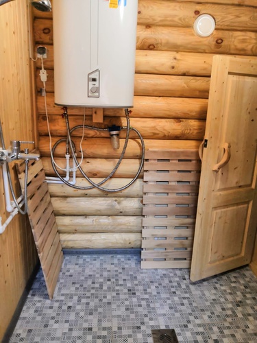 Просторная сауна, отделка выполнена вагонкой из осины. Теплый санузел с небольшой раковиной, в душевой водонагреватель.