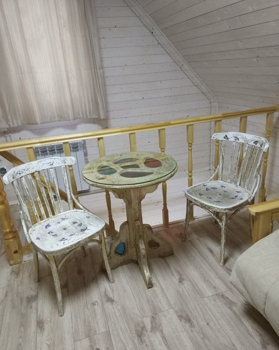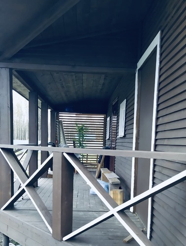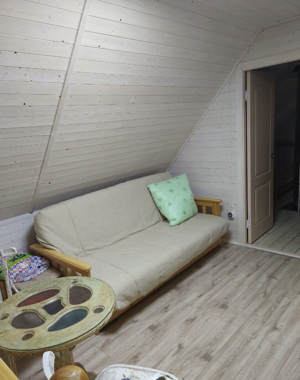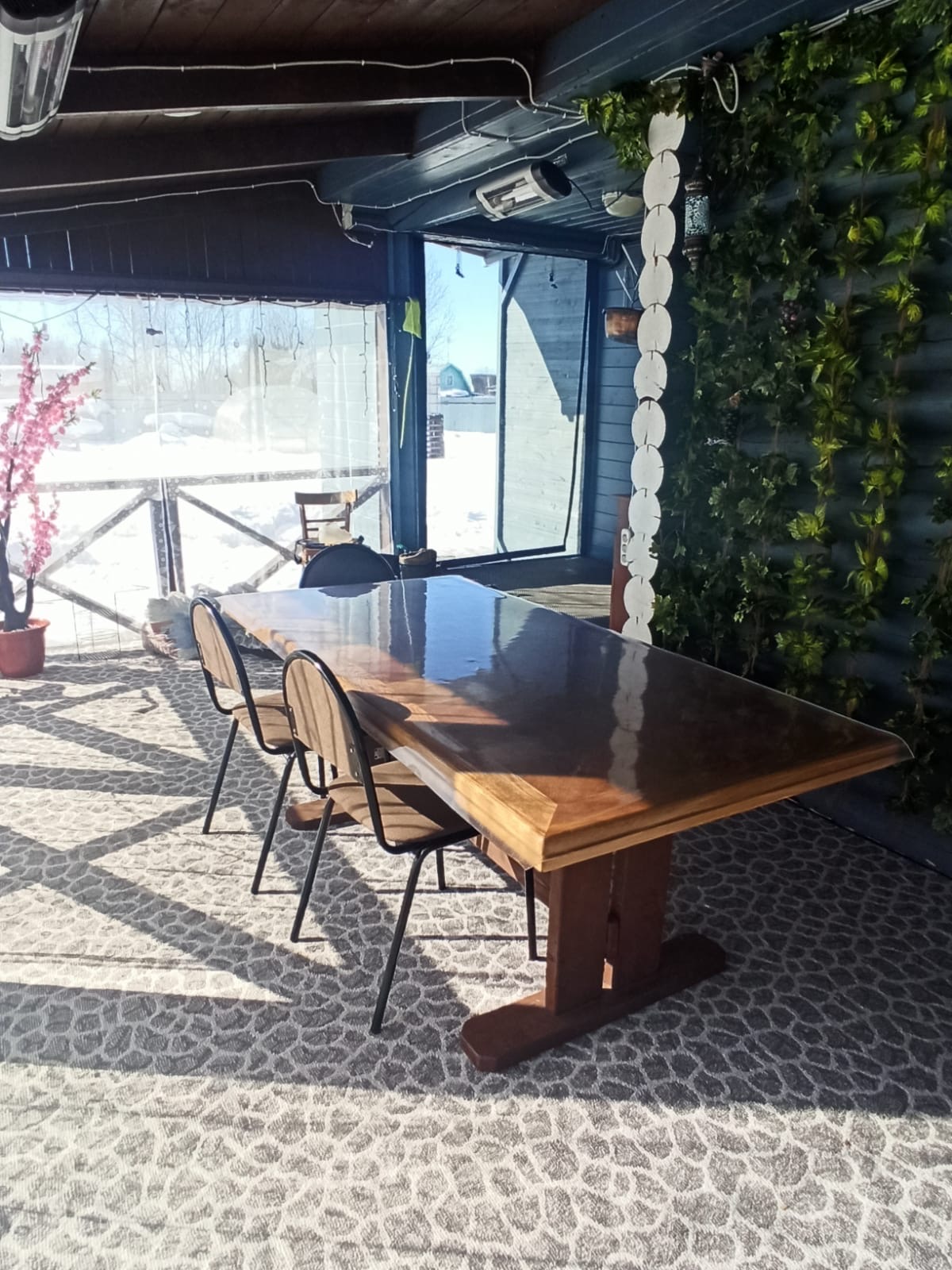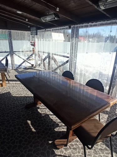 Планировка: на первом этаже находится кухня-гостиная с печью-камином, сауна, душевая и туалет. На втором этаже располагается холл и жилая комната. На террасе есть шторы из "мягкого стекла", установлены инфракрасные обогреватели, что позволяет пользоваться террасой и в холодное время года. Большой стол позволит собрать за собой всех ваших друзей.