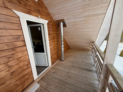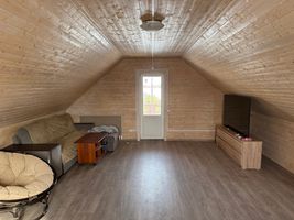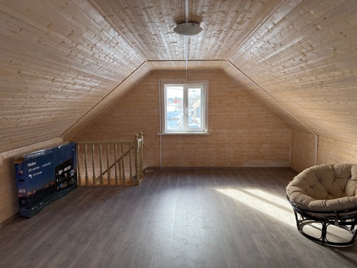 Двухэтажный дом построен в 2024 году из экологичного дерева. Общая площадь — 110 кв. м, жилая — 50 кв. м. две комнаты площадью 32 и 18 кв. м с возможностью разделения большой на 2, кухня — 14 кв. м. Высота потолков — 2,8 метра.