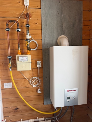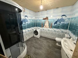 В доме один совмещённый санузел, есть балкон на втором этаже. Отопление газовое, от индивидуального котла. Все коммуникации проведены: электричество, водоснабжение из скважины(пробы воды не сдавались), газ, канализация. Подъезд к участку асфальтированный.