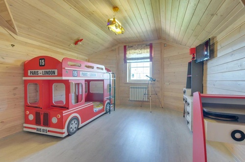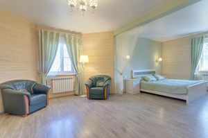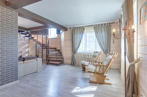 В доме 2 спальни и кабинет, 2 санузла, большая гостиная с кухней, парная с душевой.