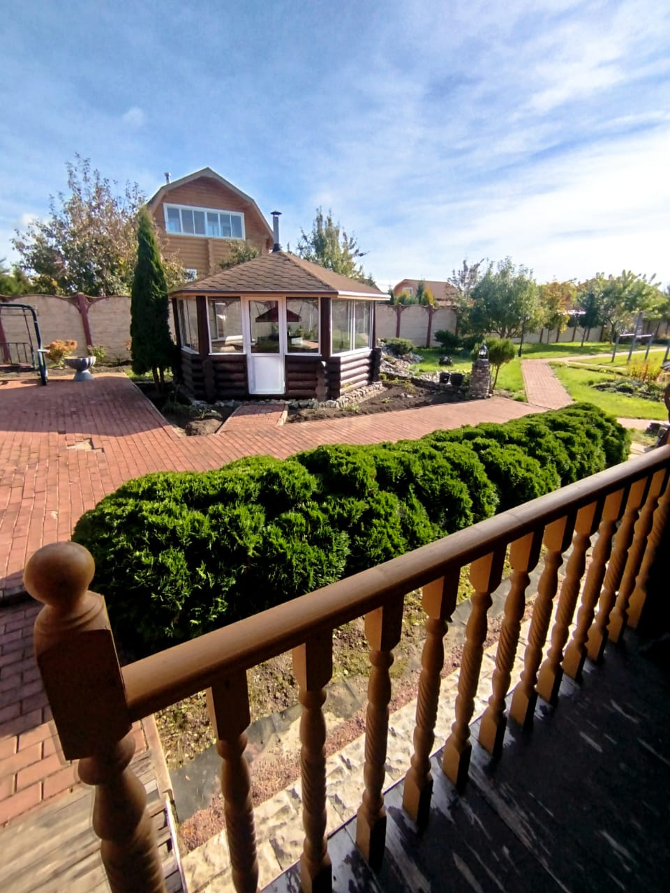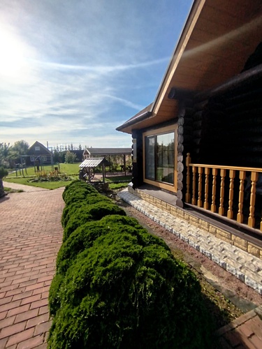 На участке выполнено благоустройство и реализован проект по ланшафтному дизайну. Все деревья и кустарники набрали свой рост, проявляя максимальную красоту.. На участке выложены дорожки и площадки из брусчатки, проведено освещение. Есть свое футбольное поле.
