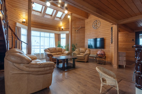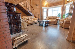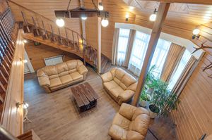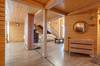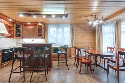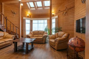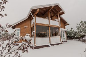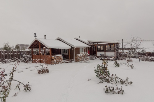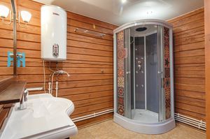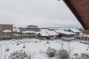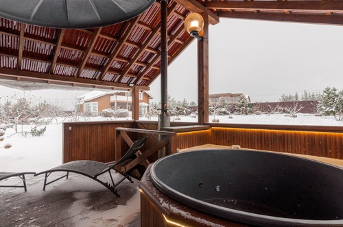 В одном здании мы видим баню 6х6м2, парную 2х2.5м с банной печью HARVIA LEGEND 240 (200 кг камня, габродиабаз), просторную помывочную с тропическим душем, туалет, комнату отдыха, гостевую комнату с кухней, оборудованная мебелью и техникой, зону барбекю, оборудованную мойкой, грилем, мебелью, зона барбекю закрыта витражным остеклением, также в банном комплексе есть террасса с купелью (вместимость 6-8 человек, с дровянной печью, аэромассажем и подсветкой), что придает неповторимость пространству.