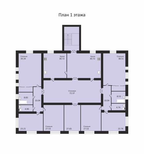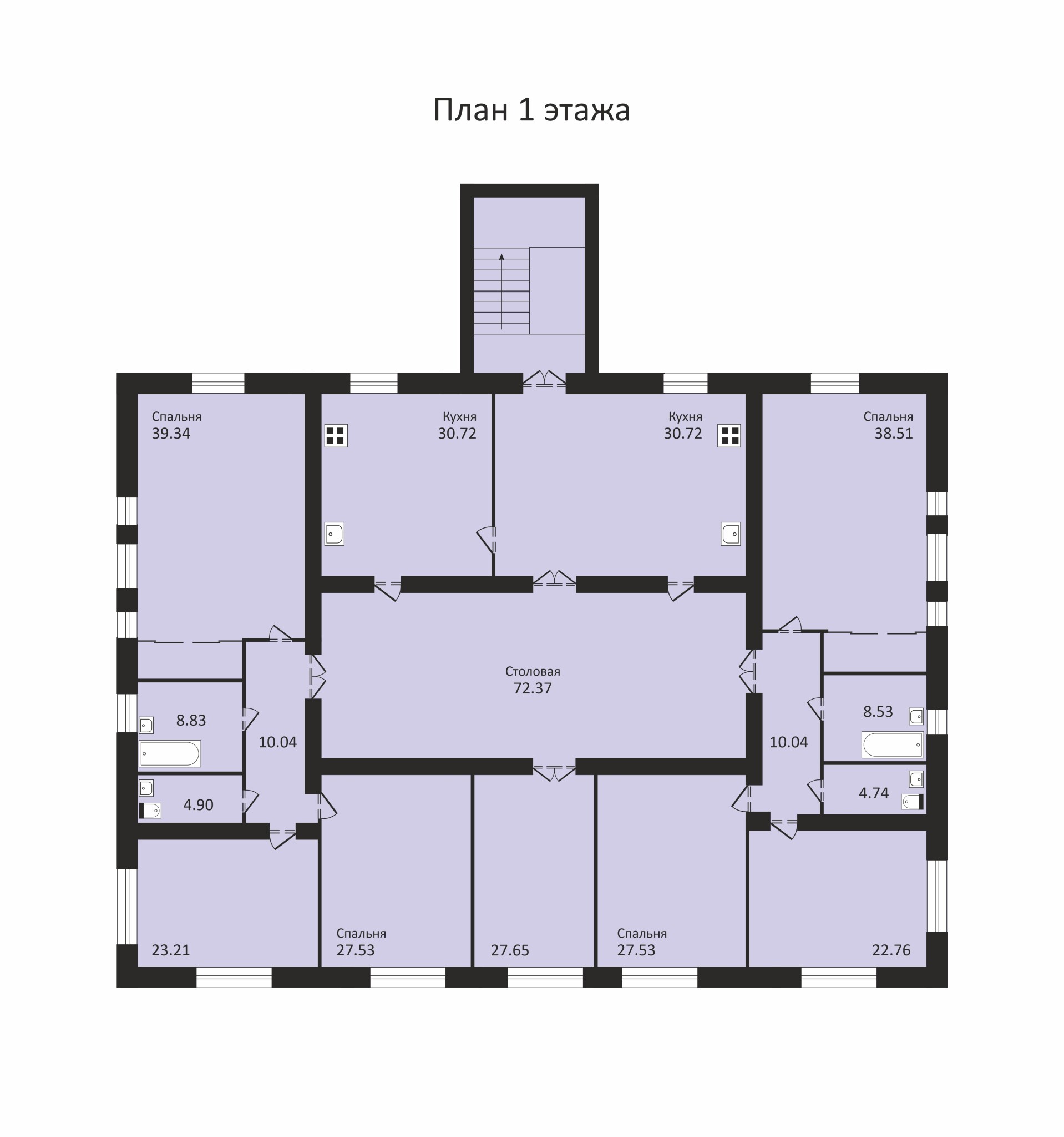 Дом предусматривает более 10 комнат разной площади: от 7,4 до 38 квадратного метра. Это просторное и светлое здание идеально подойдёт для большой семьи или людей, которые ценят личное пространство. Здесь каждый найдёт свой уголок.