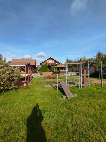 На участке выполнено благоустройство и реализован проект по ланшафтному дизайну. Все деревья и кустарники набрали свой рост, проявляя максимальную красоту.. На участке выложены дорожки и площадки из брусчатки, проведено освещение. Есть свое футбольное поле.