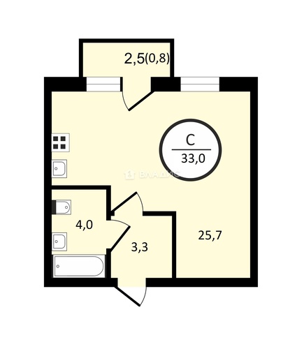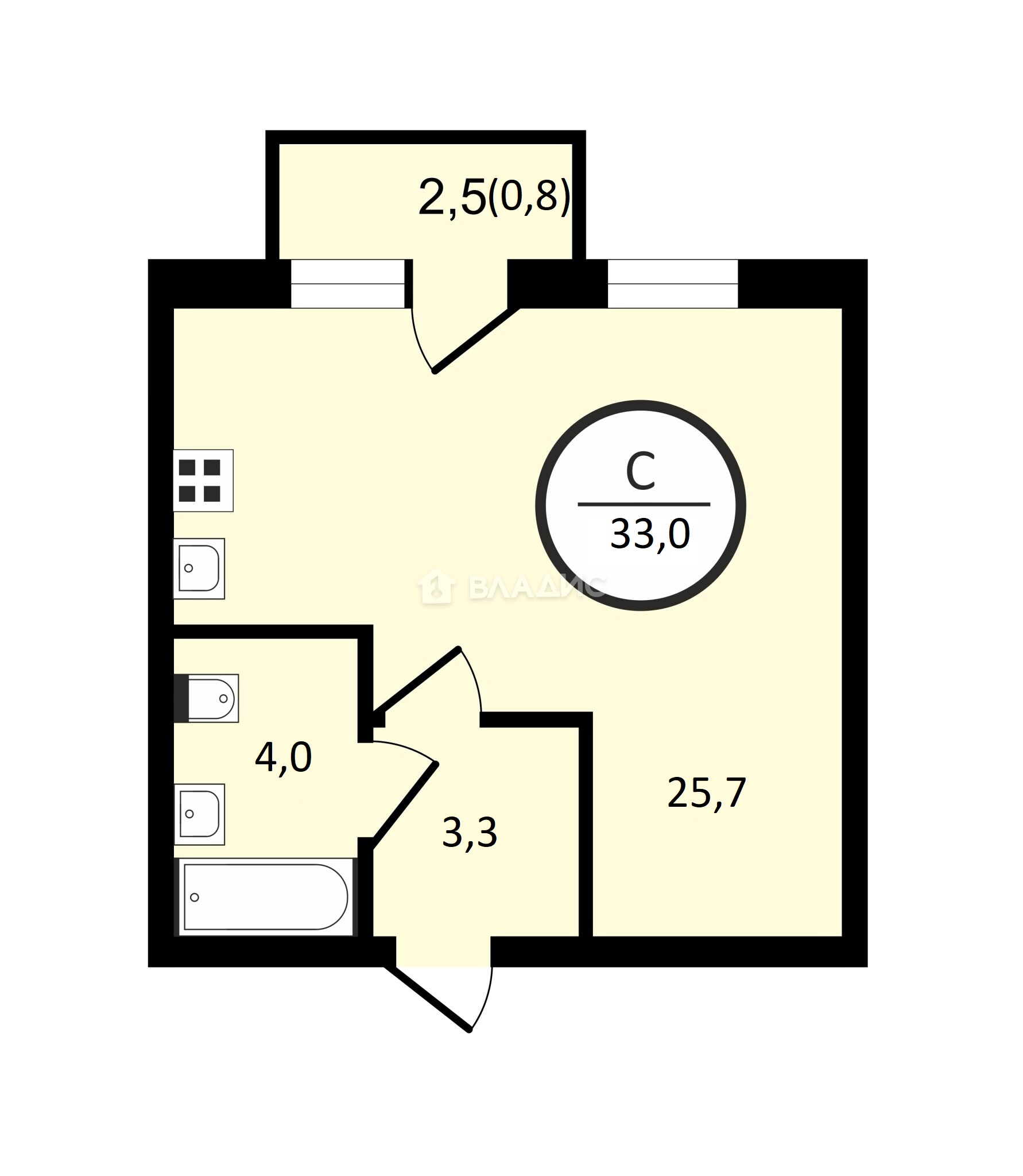 Общая площадь — 33 кв. м, жилая площадь — 16 кв. м;
